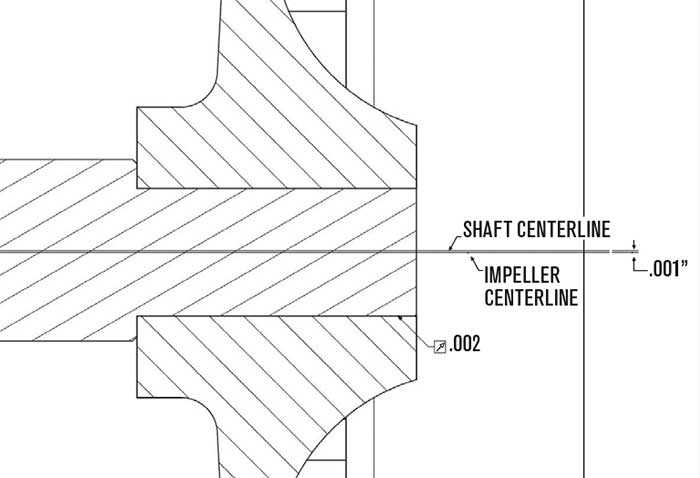 1. Runout in the shaft: This is one of the causes of imbalance in the assembly. Shaft runout will hold the impeller off center therefore creating an imbalance. An example would be a 200-ounce impeller with a shaft having 0.002-inch runout will actually offset the pump impeller centerline by 0.001 inch, which would result in a 0.2 ounce/inch imbalance. To eliminate runout in the shaft, the shaft must be straightened or replaced.
